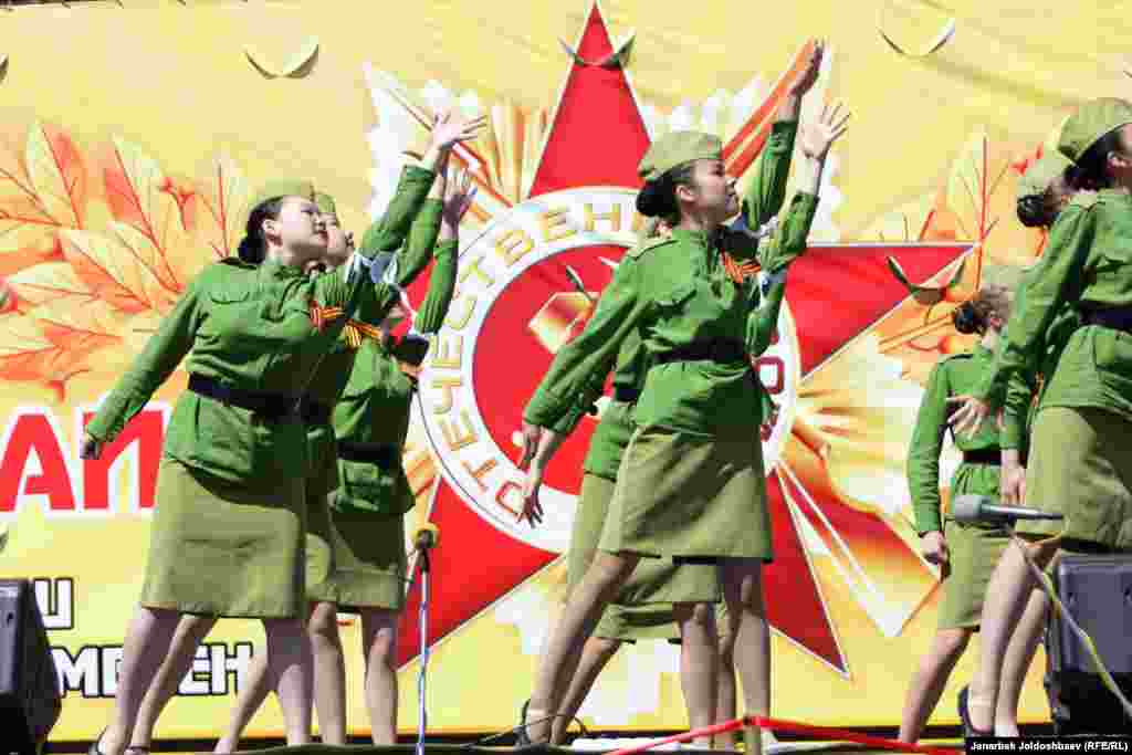 Сегодня в Бишкеке состоялось праздничное мероприятие, приуроченное ко Дню Победы. Ветеранов почтили праздничным обедом и традиционными фронтовыми 100 граммами. Кроме того, на площади Победы был организован небольшой парад военных и выступления артистов.