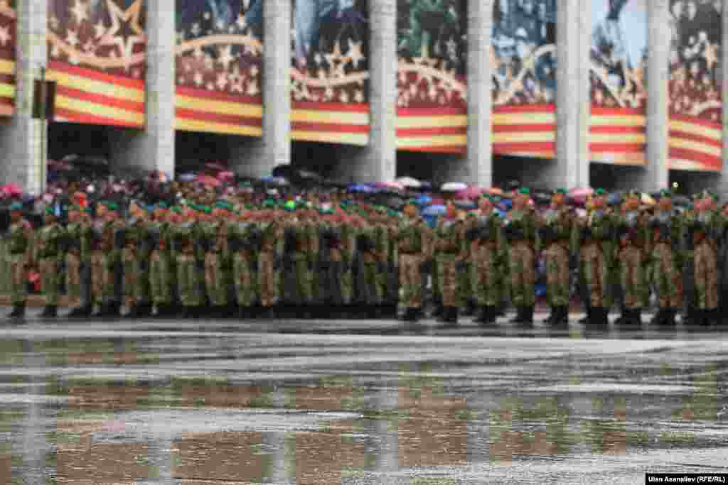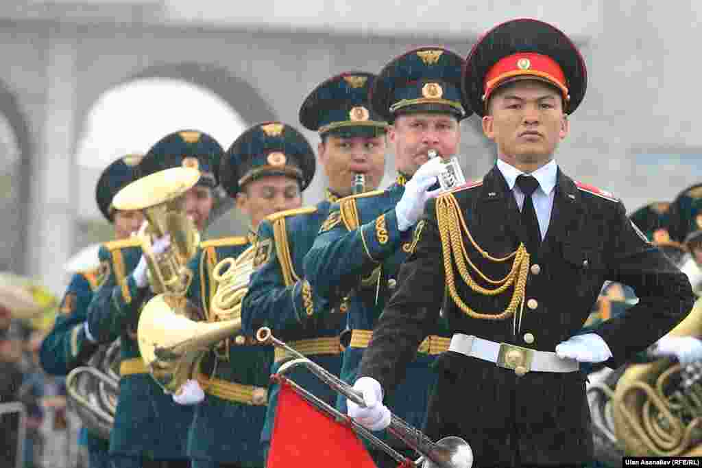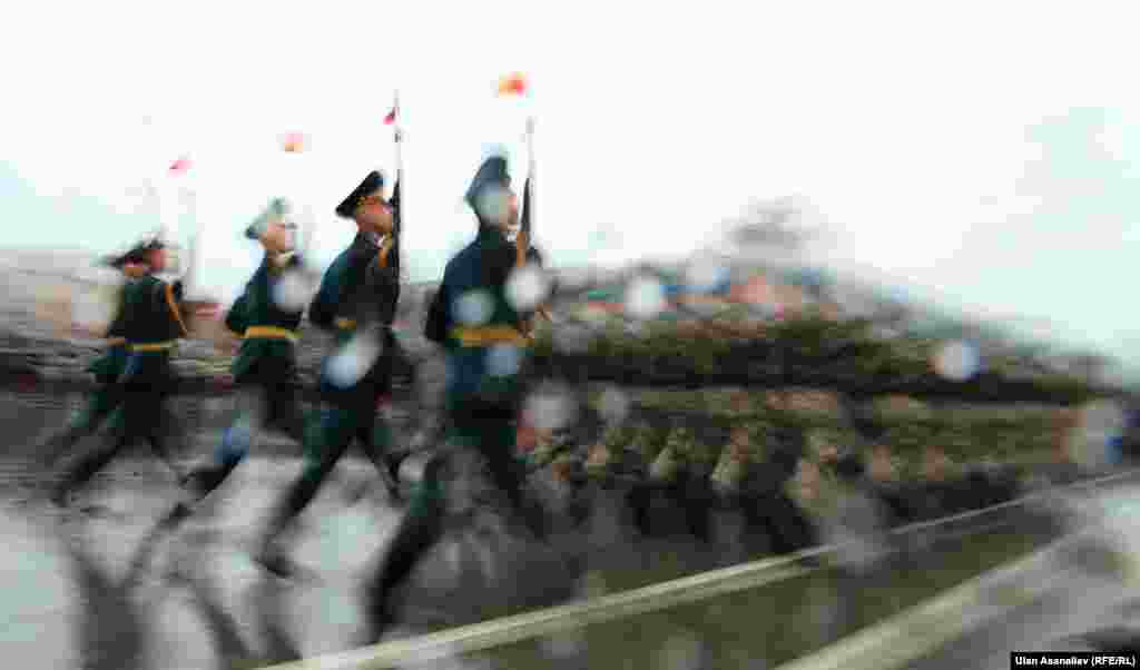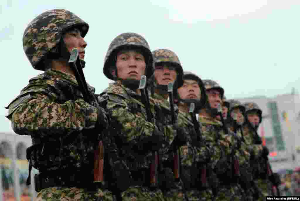 Сегодня в одном строю с военнослужащими Вооруженных сил Кыргызстана торжественным маршем по центральной площади «Ала-Тоо» прошли российские военнослужащие - парадный расчет объединенной российской военной базы в городе Канте.