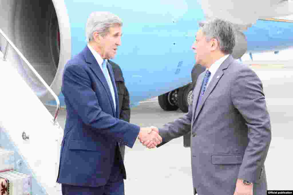 Государственный секретарь США Джон Керри прибыл в Бишкек. В аэропорту «Манас» его встретил и.о. министра иностранных дел Эрлан Абдылдаев. Джон Керри провел встречи с главой государства Алмазбеком Атамбаевым, и.о. главы МИД КР Эрланом Абдылдаевым, примнял участие в открытии здания Посольства США и нового кампуса АУЦА. Фото МИД КР, Посольства США в КР, Улана Асаналиева.