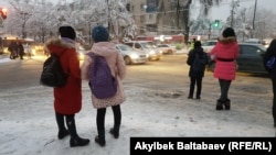 В Бишкеке 22 ноября. Остановка на пересечении улицы Боконбаева с проспектом Манаса. Мы вышли на остановку после 6 часов вечера, на улице температура воздуха составляла почти 10 градусов мороза.