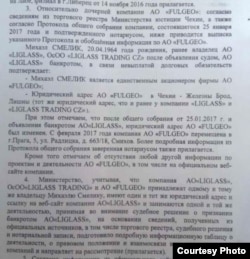В письме от 10 марта 2017 года отмечается, что Посольство Кыргызстана в Австрии предоставило информацию о компании по запросу Нацэнергохолдинга. Так, по данным, владельцем ОсОО Liglass Trading CZ является гражданин Михаэл Смелик, который также владеет АО FULGEO, а ранее он владел АО Liglass, которое было признано банкротом. Несмотря на решение суда по банкротству, АО Liglass продолжает предоставлять услуги.