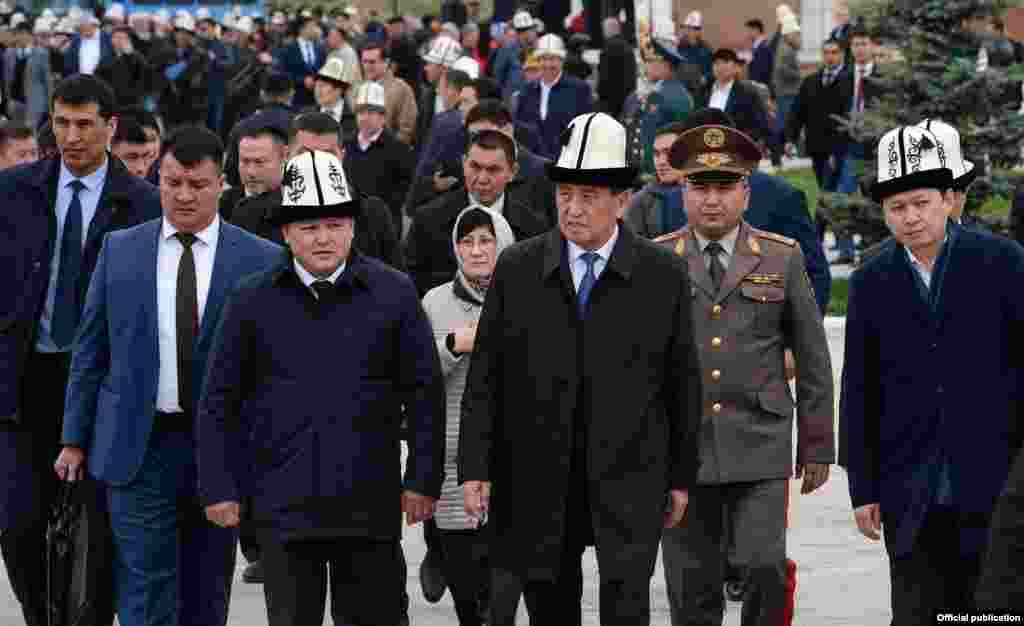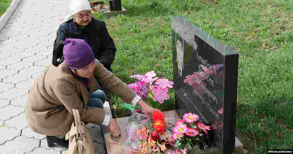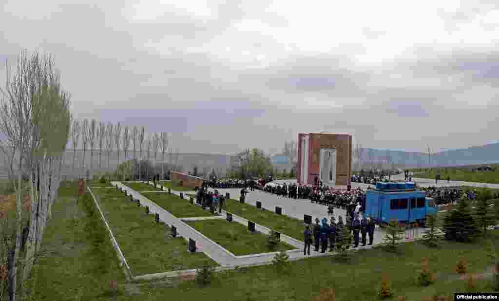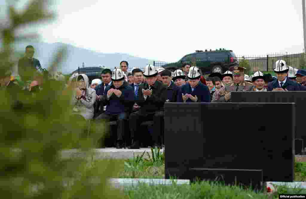 В мемориальном комплексе «Ата Бейит» состоялось поминальное мероприятие и церемония возложения цветов к мемориальной стене памяти погибших в апрельских событиях 2010 года. Здесь похоронены погибшие во время апрельских событий кыргызстанцы, они боролись с семейно-клановым режимом Курманбека Бакиева. Фото пресс-службы президента и парламента.
