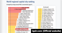 В рейтинге столиц с самым вредным воздухом по итогам 2019 года Бишкек оказался на 16 месте.