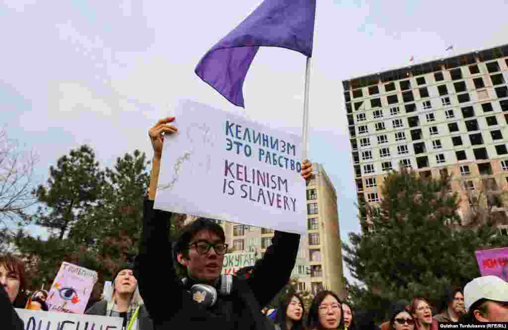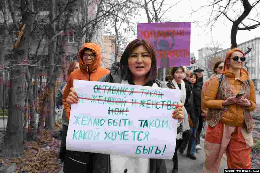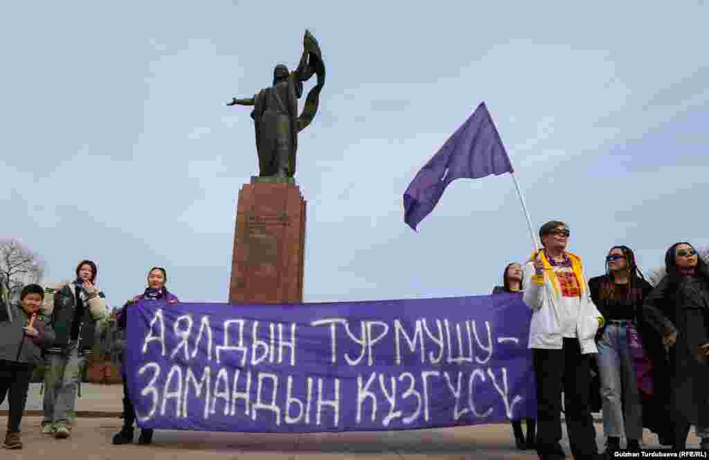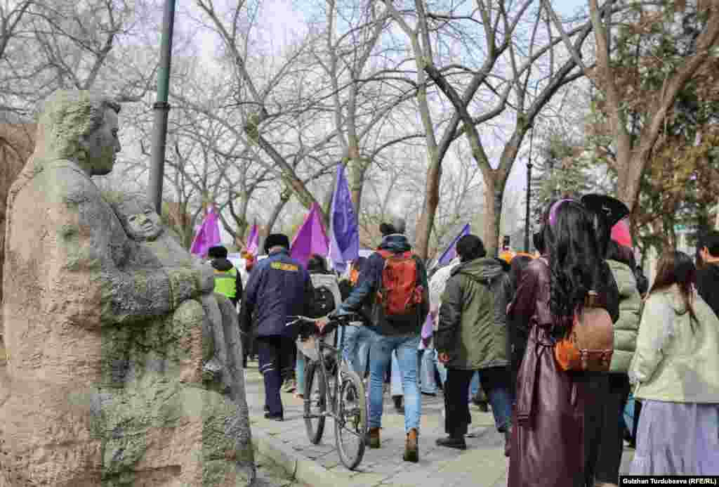 В Бишкеке 8 марта в Международный женский день прошел марш за права женщин. Шествие под лозунгом «Жизнь женщины – зеркало времени» началось от памятника борцам революции на проспекте Чуй и завершился в сквере имени Горького по улице Исанова.