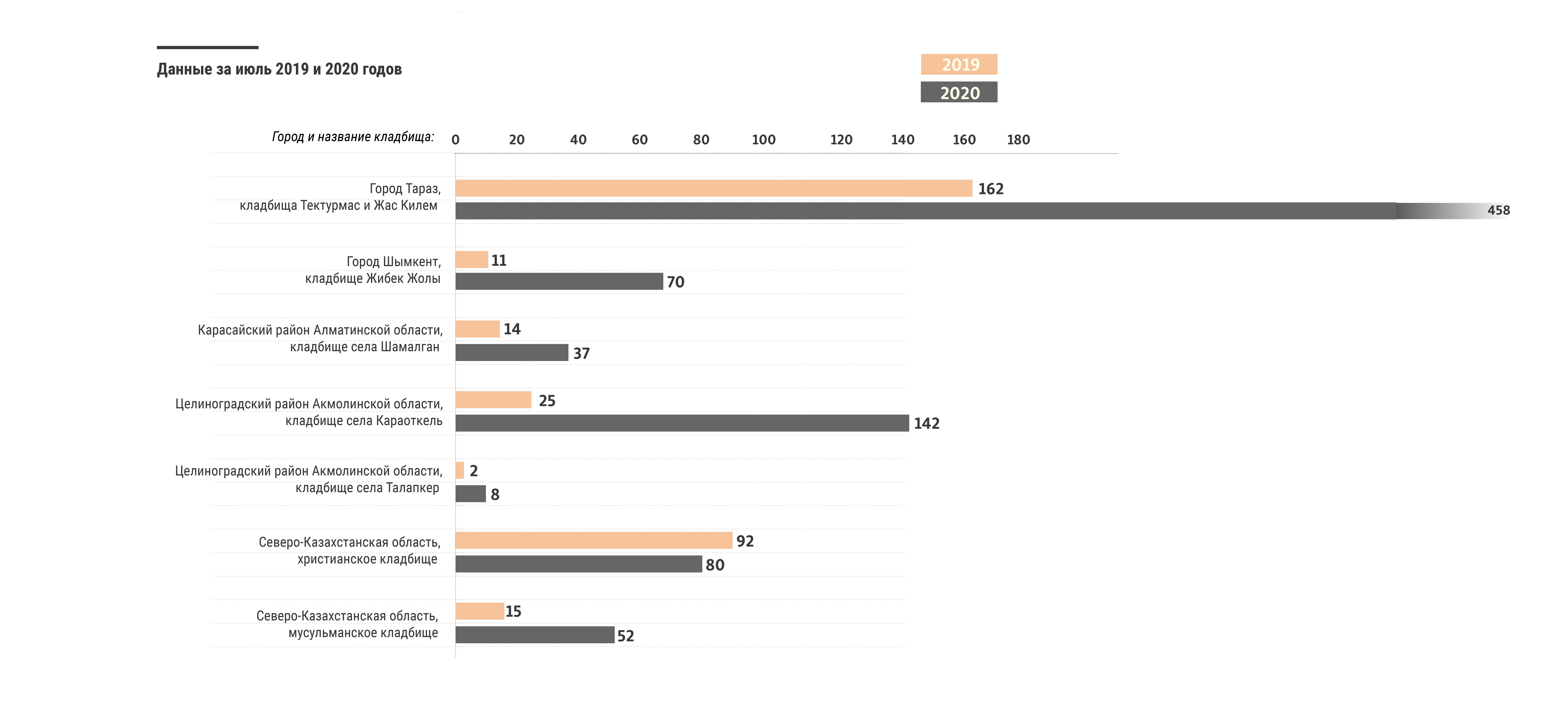 В июле прошлого года на кладбище села Караоткель в Акмолинской области было похоронено 15 человек, в июле этого года — 49. Здесь увеличение показателя составляет 326 процентов. На кладбище села Талапкер близ Нур-Султана в июле прошлого года был похоронен один человек, в июле нынешнего там появилось семь новых могил. На кладбище села Шамалган Карасайского района Алматинской области увеличение четырехкратное: восемь могил за июль прошлого года и 32 — за июль нынешнего.