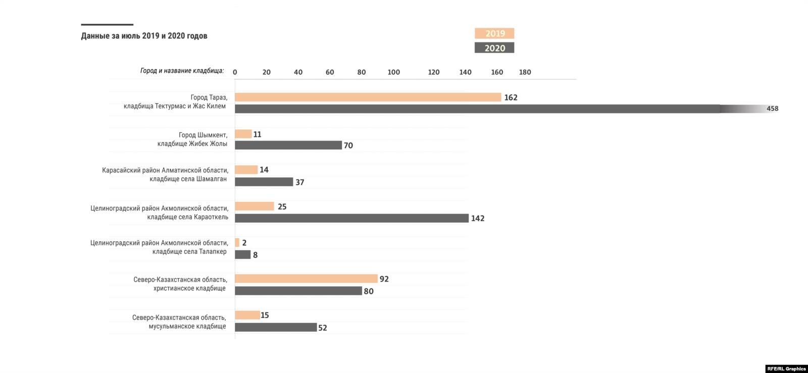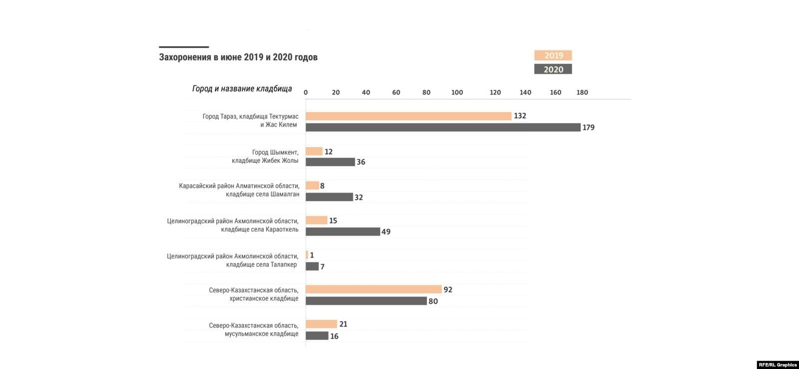 Всего на семи кладбищах, посещенных репортерами Азаттыка, количество захороненных в июне 2020 года увеличилось примерно на 260 процентов по сравнению с июнем 2019 года.