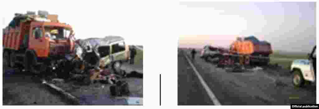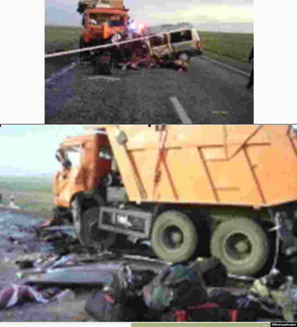 В Карагандинской области в ночь на вторник, 8 мая 16 человек погибли при столкновении КамАЗа и микроавтобуса на трассе Алматы - Екатеринбург. Двое доставлены в ближайшую больницу. Фотографии предоставлены пресс-службой Департамента внутренних дел Карагандинской области Казахстана.