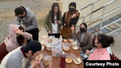 Айчурок: Мы тоже сначала были очень напуганы, неизвестность пугает. Но день ото дня страх отступает и уходит прочь. Чем мы занимаемся? Развлекаем себя, как можем, рассказываем друг другу истории из жизни, очень интересно, кстати. Узнаёшь много нового о культуре и людях другой страны. Играем в карты и «Мафию». С утра привозят завтрак в виде каши и вареных яиц, в обед -  первое и второе, на ужин – какое-нибудь блюдо с салатом. Вместе кушаем на свежем воздухе.