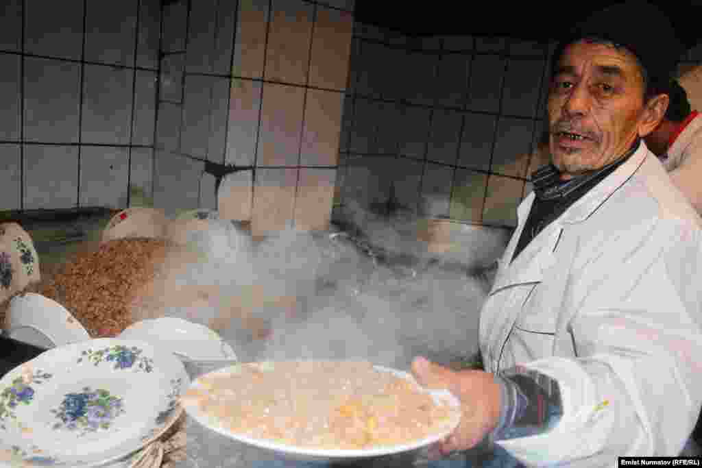 Как сообщил "Азаттыку" один из организаторов акции Дилмурад Ишанов, идея организовать дружеский плов для представителей узбекской и кыргызской общины Оша зародилась недавно. "В преддверии новогодних праздников мы хотели организовать такое мероприятие, которое бы объединило всех жителей нашего города за одним дасторконом. Что нас всех объединяет в Оше? Это наш знаменитый на весь мир ошский плов", - сказал Дилмурад Ишанов. Фотографии Эрниста Нурматова, "Азаттык", Кыргызская служба РСЕ\РС