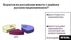 Среди основных причин национализма люди называют вызывающее поведение национальных меньшинств, плохие условия жизни в России и террористические акты последних лет. 42% опрошенных считают, что российские власти борются с крайним русским национализмом, в то время как 20% граждан уверены, что власти поощряют национализм и способствуют его распространению.