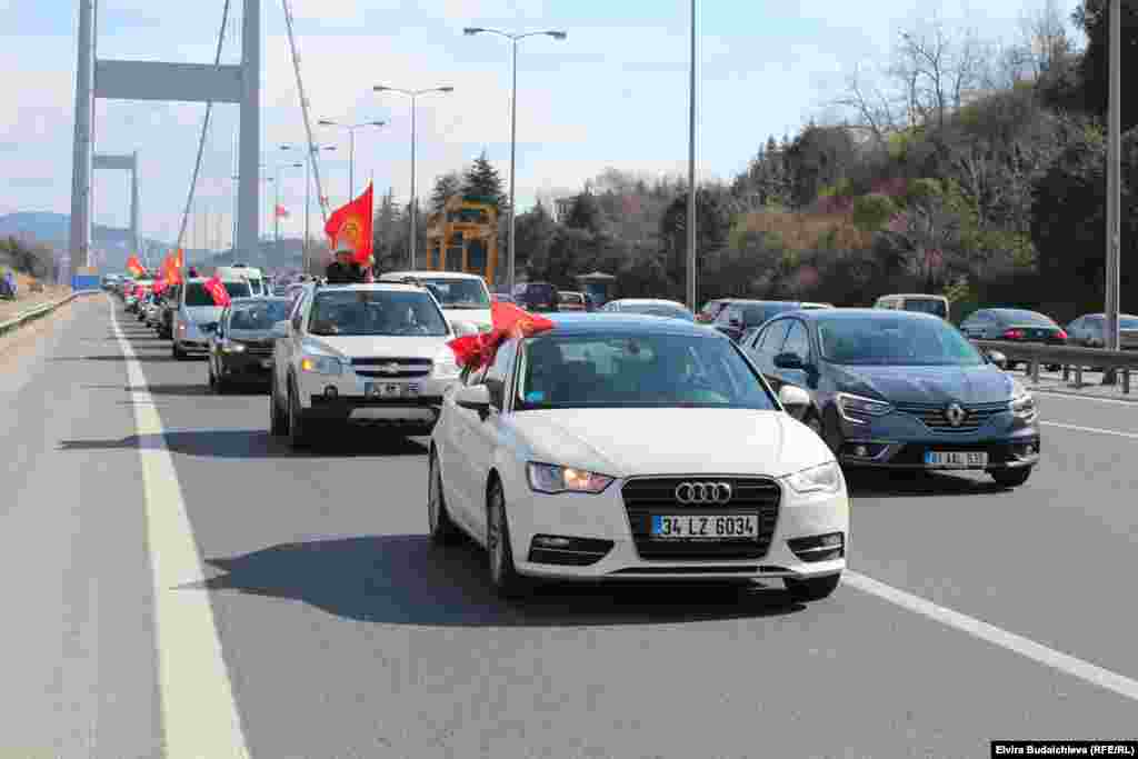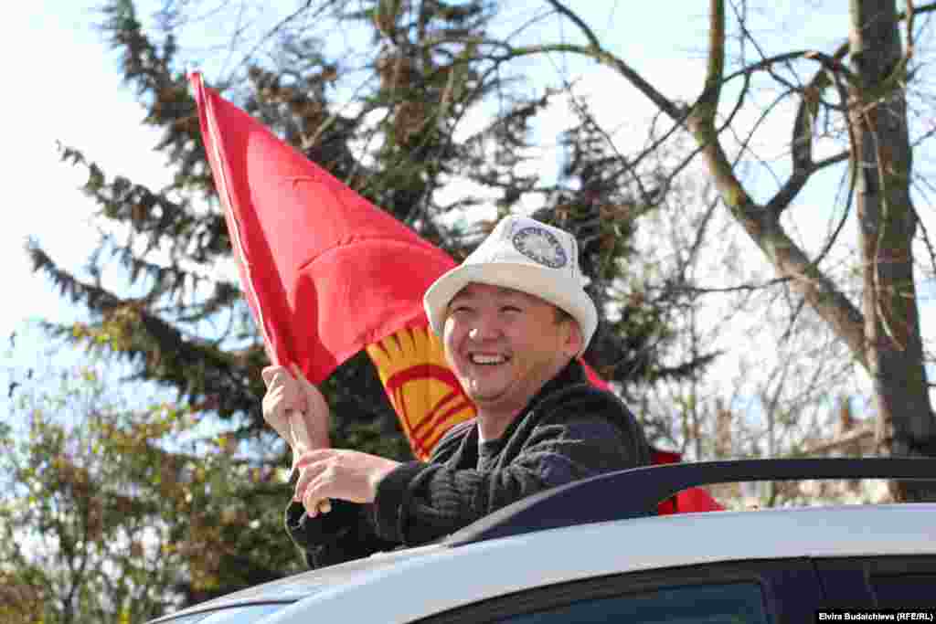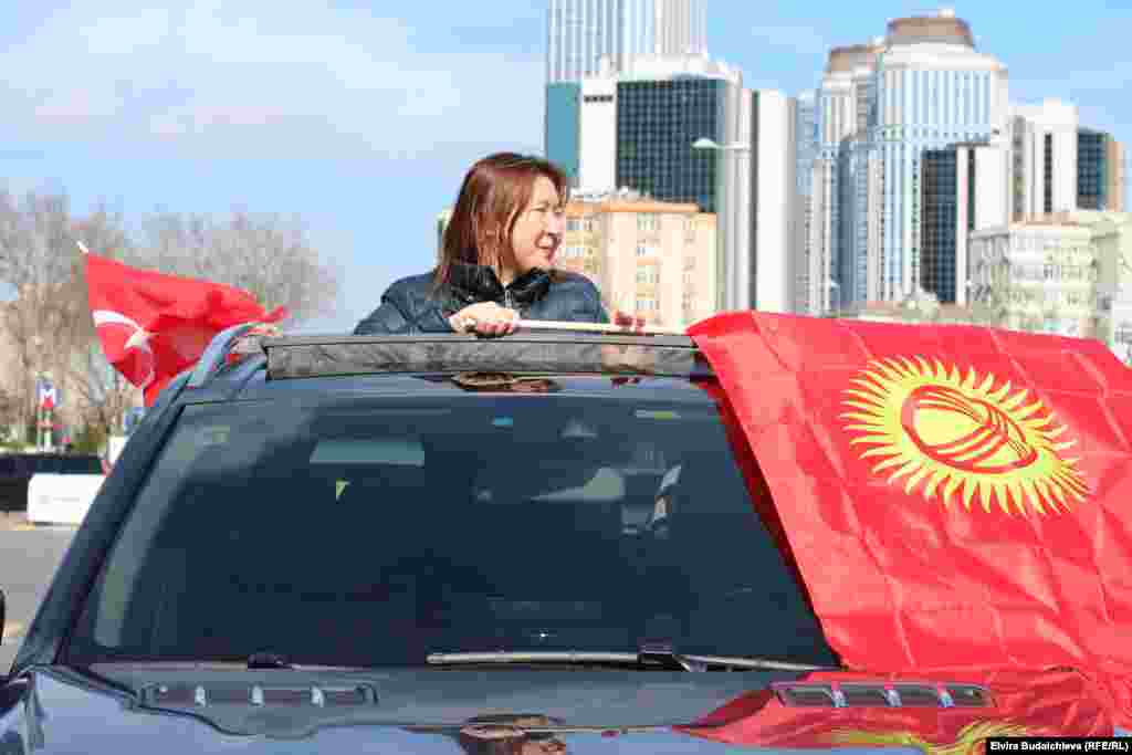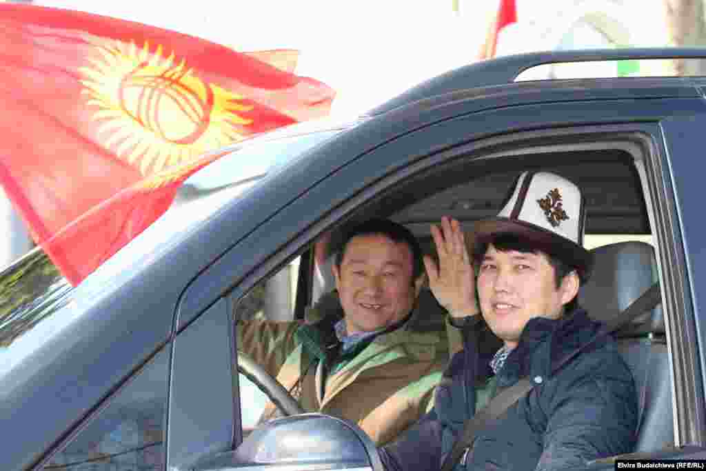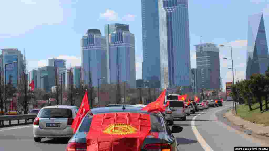 Члены общества Дружбы и культуры Кыргызстана проехали на около 30 автомашинах по городу, развевая флаг Кыргызстана.