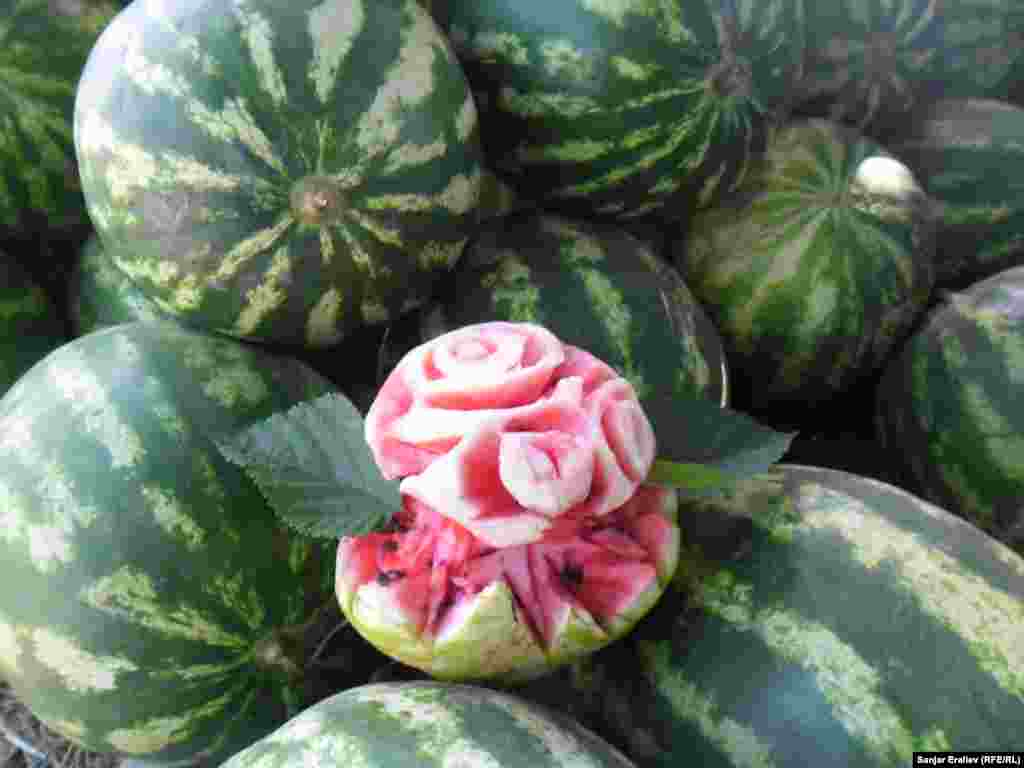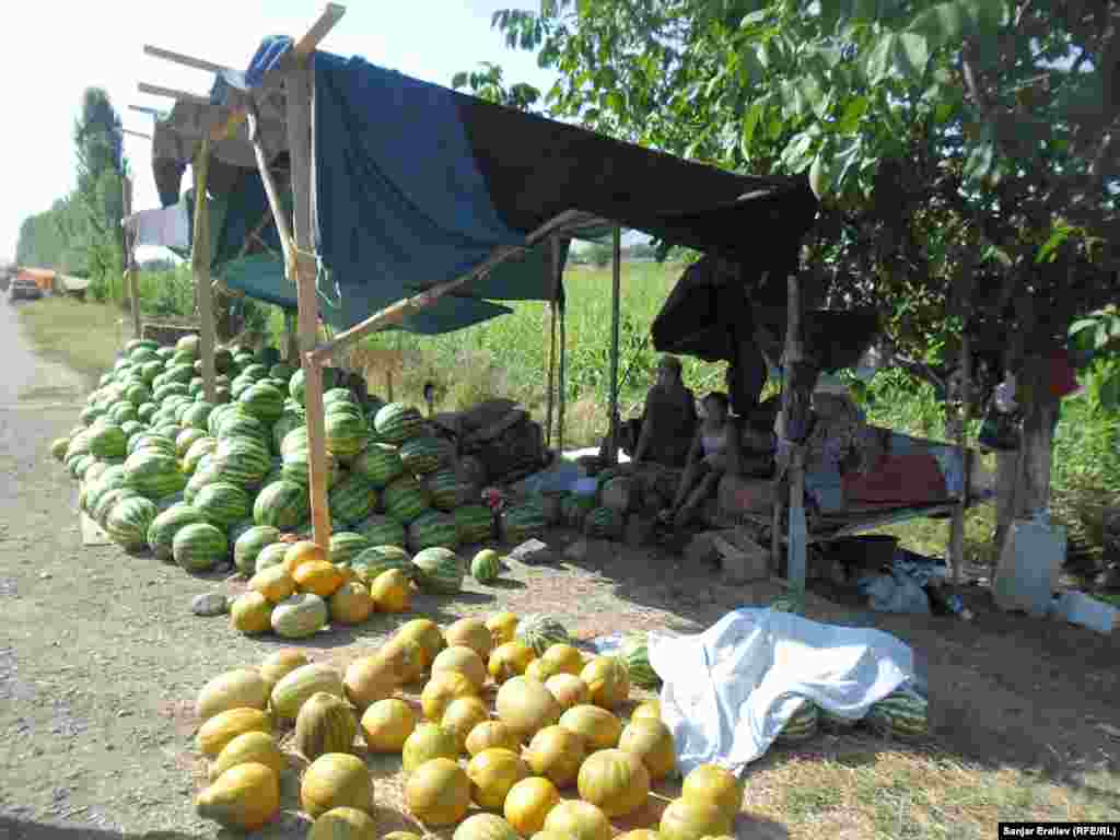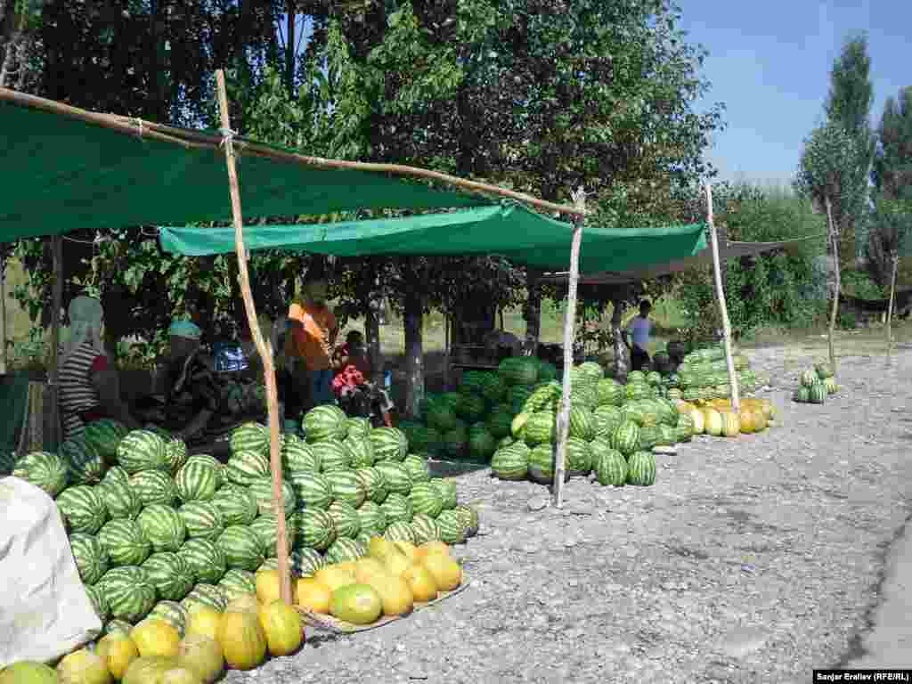 Вдоль автотрассы Бишкек-Ош у самого села Акман (Базар-Курганский район) растянулись ряды импровизированного арбузного базара. Местные крестьяне продают их от 5 до 100 сомов за одну штуку в зависимости от размера. Фоторепортаж Санжара Эралиева, корреспондента Кыргызской службы РСЕ\РС "Азаттык".