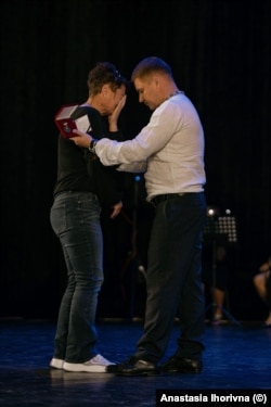 Медали вручали в большом зале в центре Ровно. Масштабные мероприятия на открытом воздухе запрещены по всей Украине из-за опасений возможных ракетных ударов.