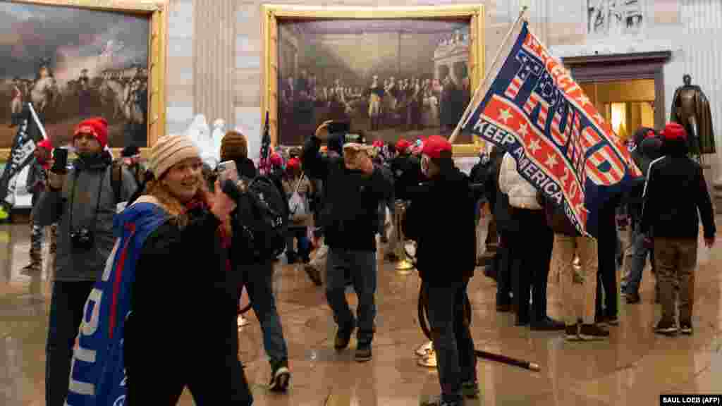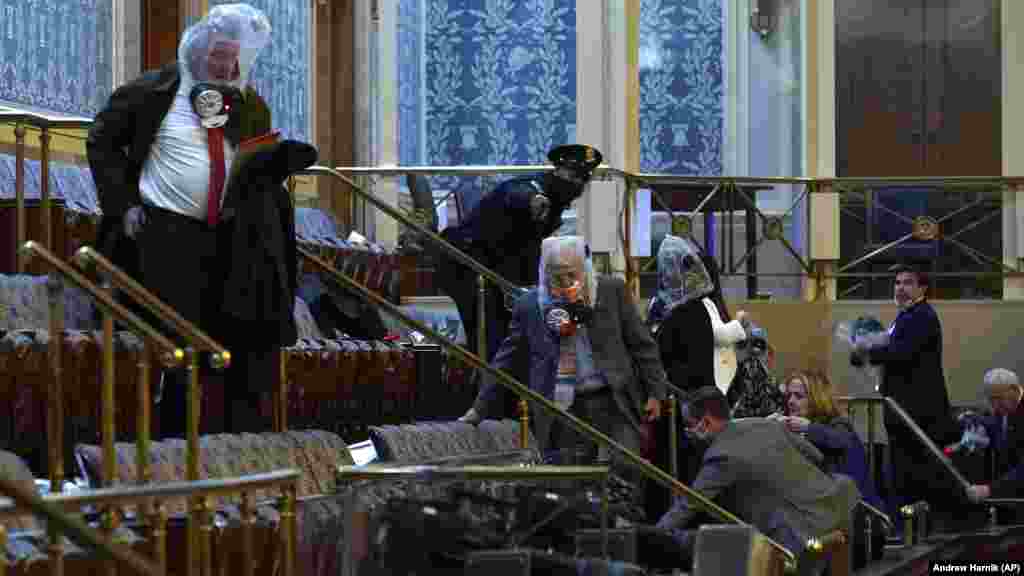 Люди прячутся в галерее Капитолия, когда толпа пытается проникнуть в здание.