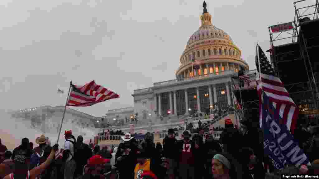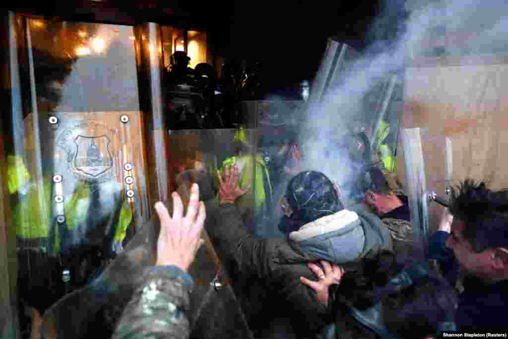 Полиция применяет слезоточивый газ, чтобы разогнать толпу радикальных сторонников Трампа у здания Капитолия.