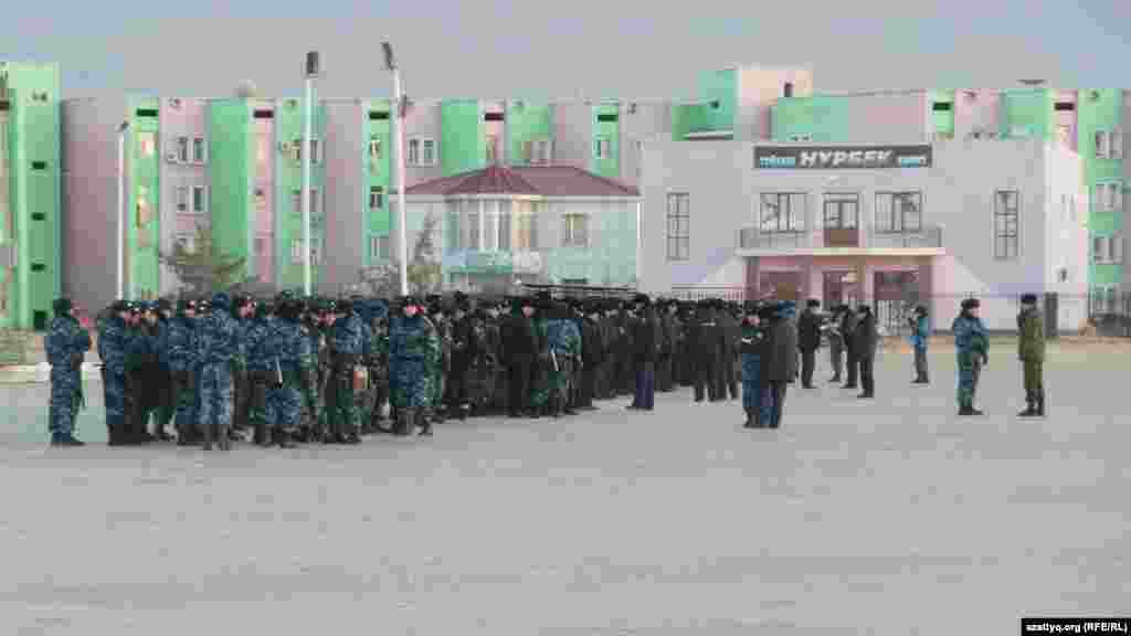 Полицейские машины на центральной площади Жанаозена.